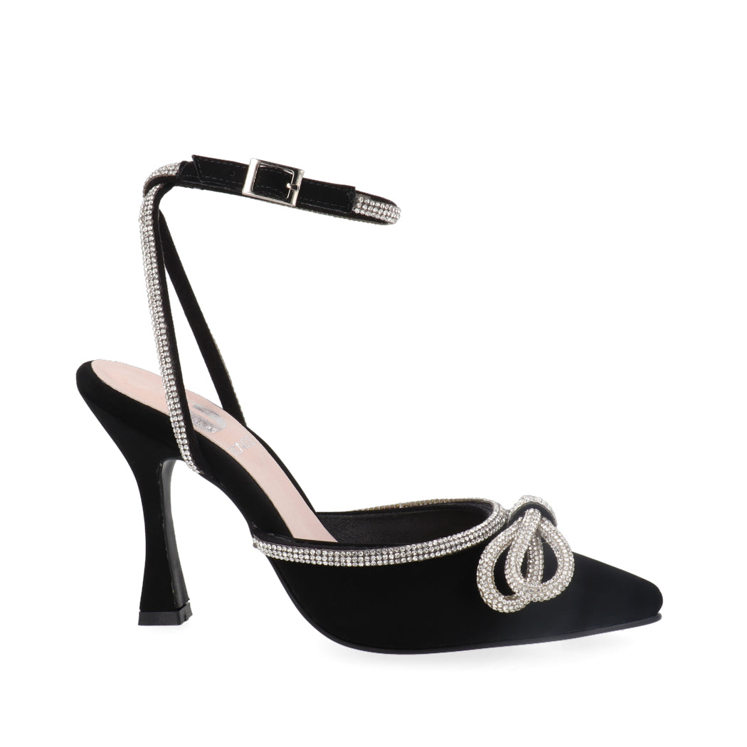 Esta zapatilla de tacón medio tiene un estilo moderno y elegante. Está hecha de material sintético suave con una decoración en brillo y un moño en la parte delantera. La correa de ajuste hace que sea cómoda para llevar. Esta zapatilla es perfecta para ir a fiestas, bodas, citas, etc. está disponible en color Negro. ¡Es una gran elección para agregar un toque de elegancia a tu look!
